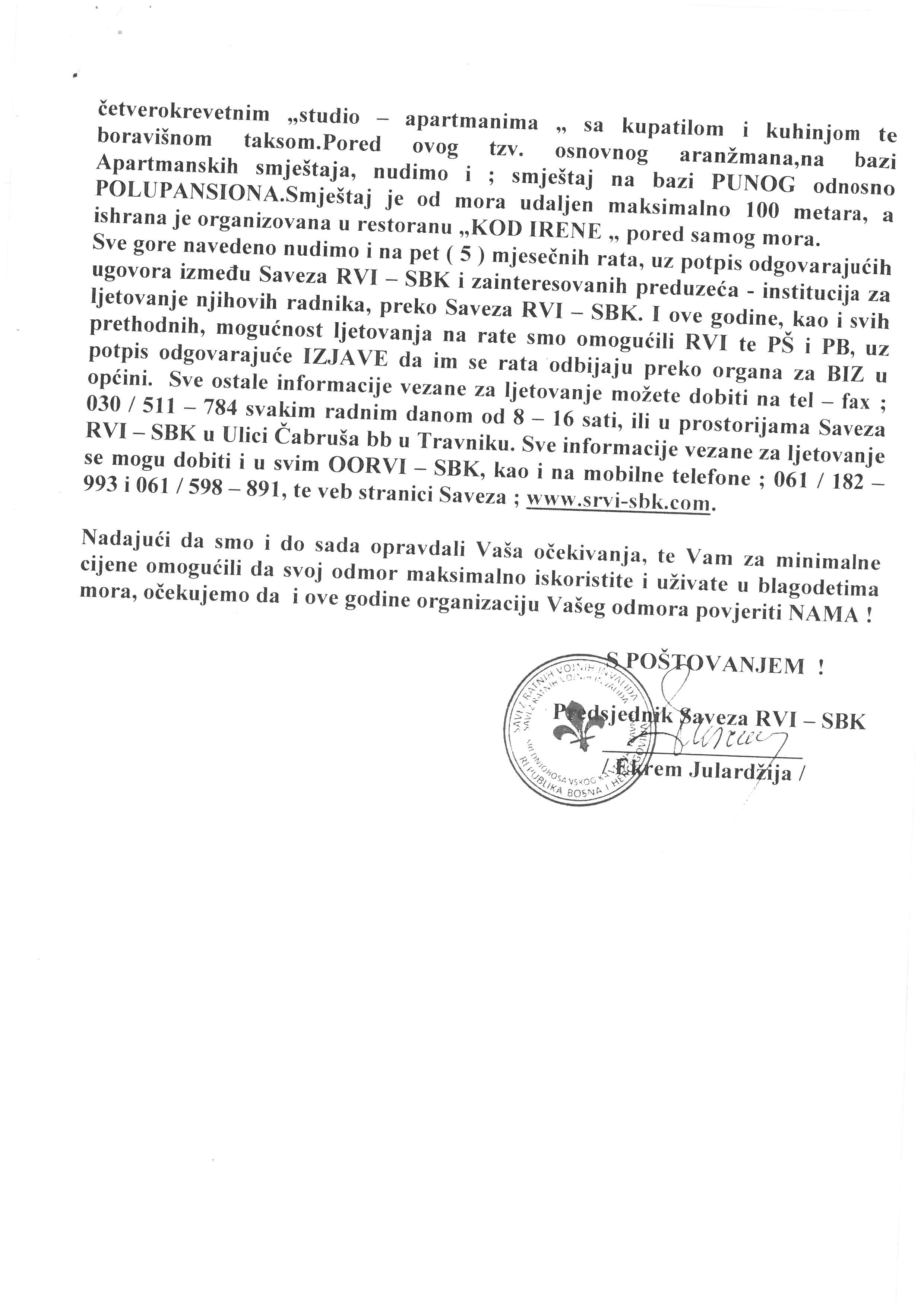 Sve gore navedeno nudimo na šest (6) mjesečnih rata, uz potpis odgovarajučih ugovora između Saveza RVI–SBK i zainteresovanih preduzeta - institucija za ljetovanje njihovih radnika, preko Saveza RVI – SBK. I ove godine, kao i svih prethodnih, mogučnost ljetovanja na rate smo omogućili RVI te PŠ i PB, uz potpis odgovarajuće IZJAVE da im se rata odbijaju preko organa za BIZ u općini.