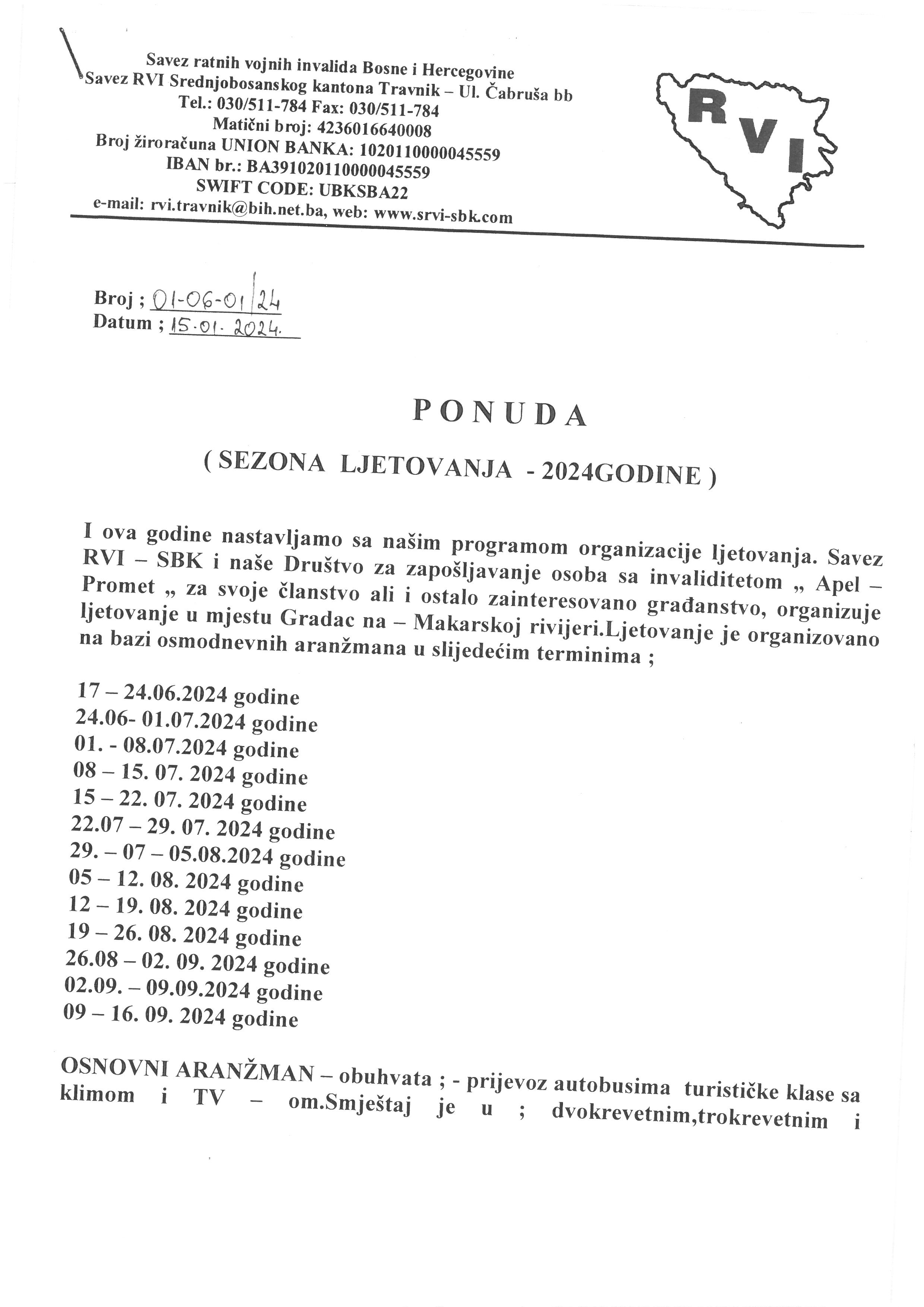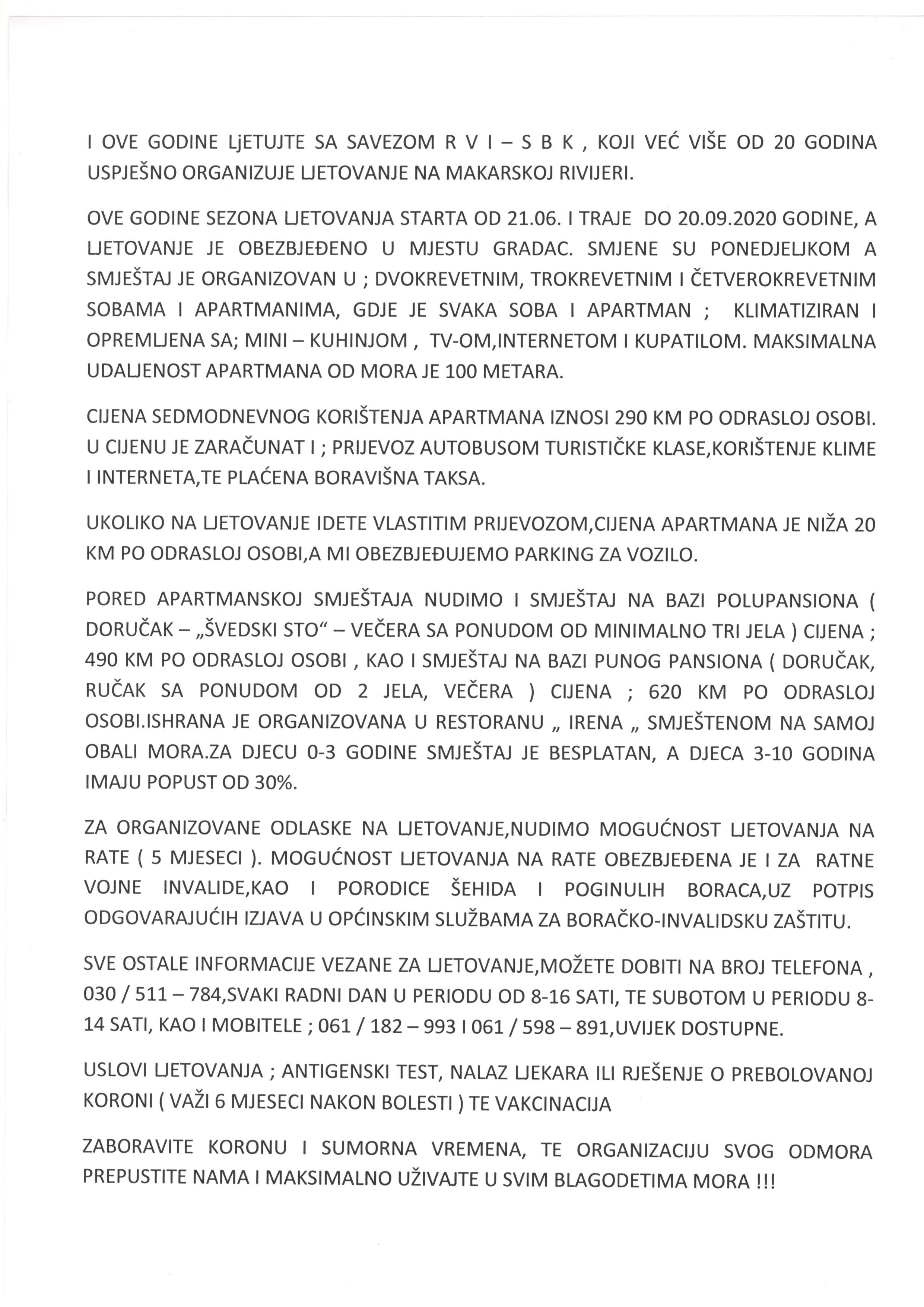Devetnaestu godinu za redom Savez RVI –SBK i naše Društvo za zapošljavanje osoba sa invaliditetom "Apel–Promet" za svoje članstvo ali i ostalo zainteresovano građanstvo, organizuje ljetovanje u mjestu Gradacu na najljepšem dijelu Jadrana – Makarskoj rivijeri. Ljetovanje je organizovano na bazi osmodnevnih aranžmana u slijedećim terminima. Kao i svih prethodnih godina, mogučnost ljetovanja na do 6 mjesečnih rate smo omogućili RVI te PŠ i PB, uz potpis odgovarajuće IZJAVE da im se rata odbijaju preko organa za BIZ u općini.
